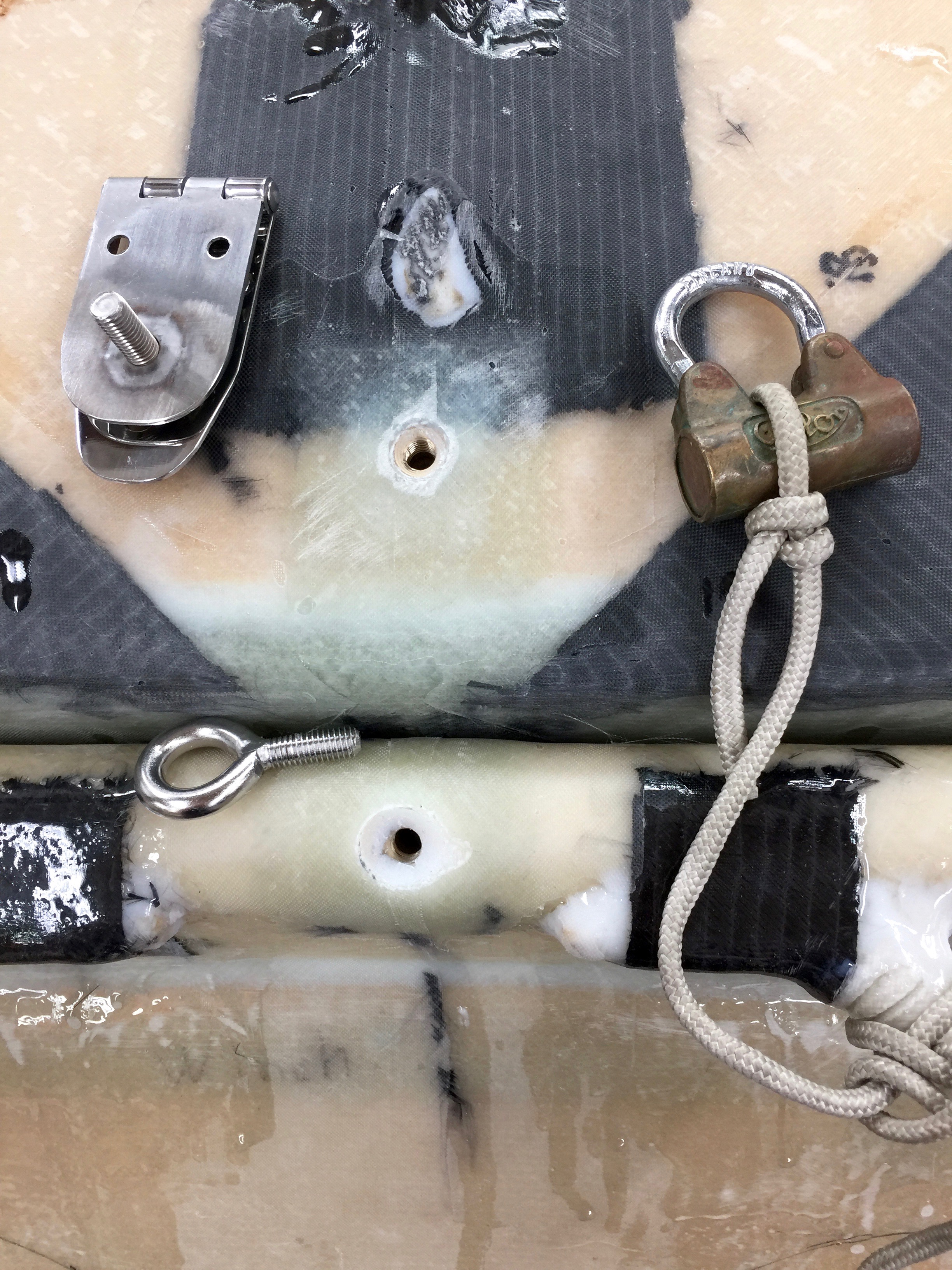 Locking devices gets damaged by salt water therefore its a good idea to put your locks in a place not exposed to the elements during a passage. During the years I have used several methods depending on the hatch. My hatches nowadays are sliding but they also can be clamped down into a gasket. Therefore they have to move not only forward but also a bit up and down. That complicates things a bit. To overcome that I use two padlocks, one on each side of the hatch. Of course it is very easy to break into a boat, even a small crewbar easily opens any hatch. The idea is to make the boat look locked. I think two padlock gives a better messages than one, but it is because Exlex hatch slides on ropes that I use two padlocks.