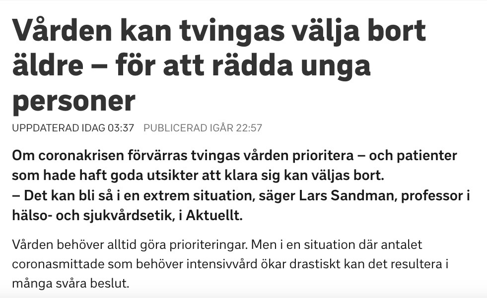 Even worse. We do not have enough equipment to handle the sick. Therefore instead of getting better hospotals The Council for Hospital Ethics have come up with new guidelines and regulations: Older persons should be unplugged to give place for younger. It certainly is an easy way out, but it scares me.